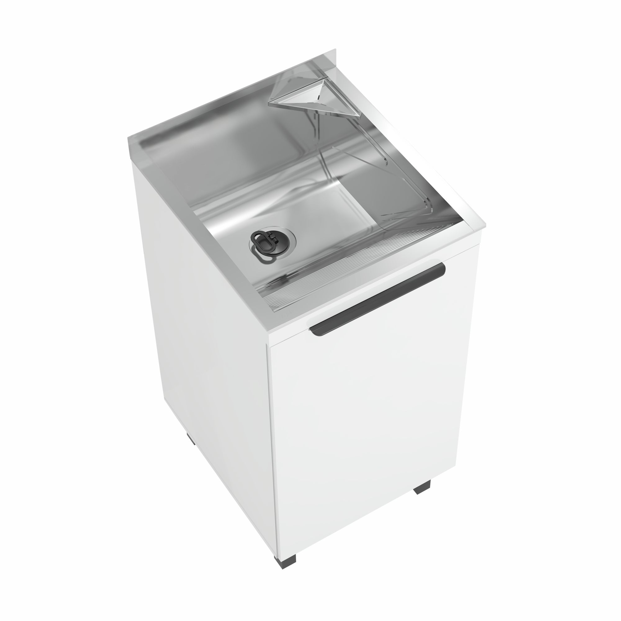 O KIT LAVANDERIA MINI é composto por tanque em inox de 32 litros, estrutura em MDP na cor branca, puxador slim, mais alongado e centralizado facilitando a abertura. Acompanha pés em polímero com regulagem de altura, ideal para higienizar o chão abaixo do KIT. No interior do armário possui amplo espaço para guardar baldes e prateleira para melhor organização dos produtos de limpeza.