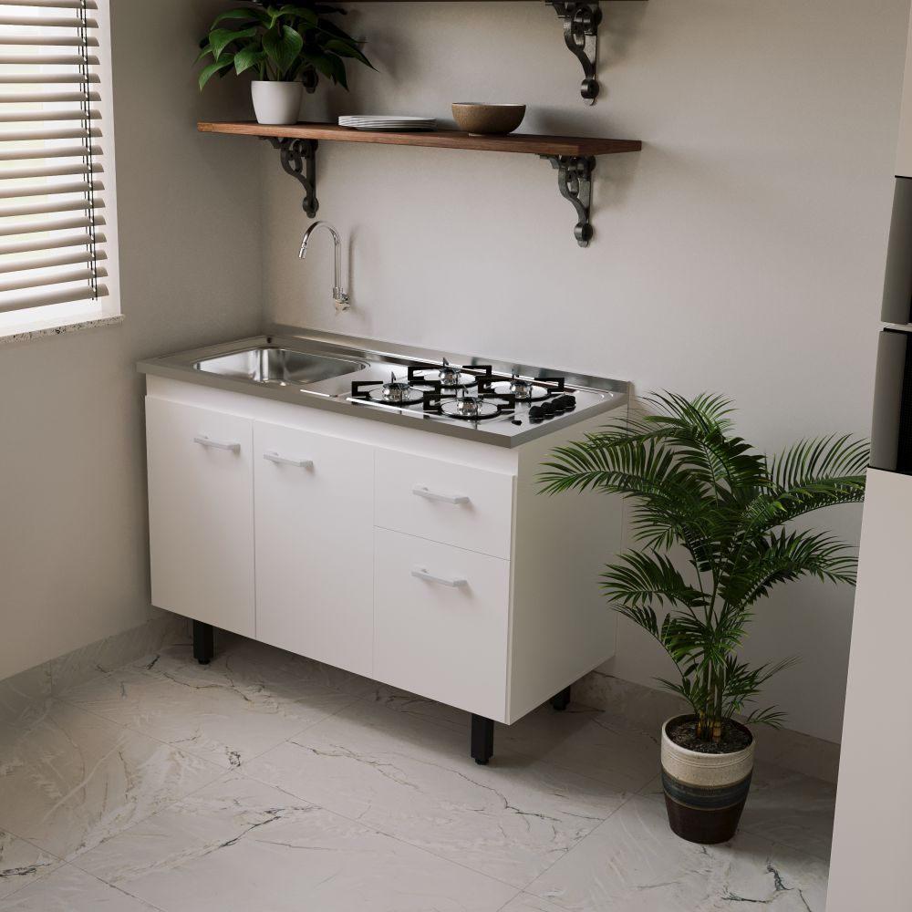 A versatilidade também se destaca: a opção que une fogão de 4 bocas com pia é ideal para quem gosta de cozinhar com mais liberdade; já a versão com cooktop de 2 bocas e cuba menor, é perfeita para studios ainda mais compactos.